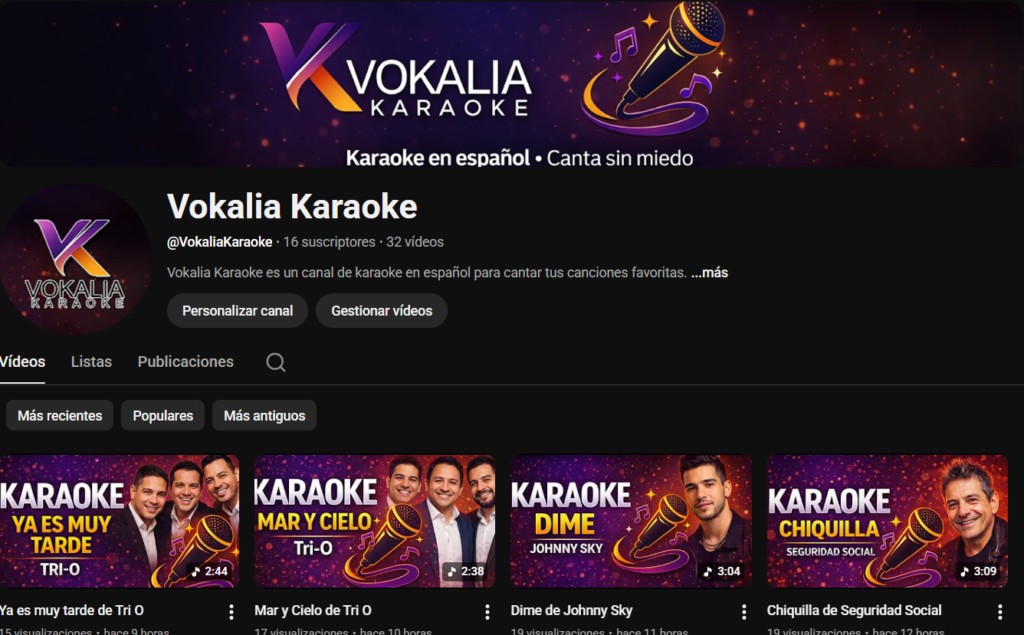 Vokalia Karaoke es un proyecto digital de un canal de karaoke en español con letras sincronizadas, concebido con una identidad clara y coherente, donde el diseño visual y la experiencia de usuario están pensados para facilitar y potenciar el canto. Desde el branding hasta la ejecución audiovisual, el creador demuestra dominio en composición gráfica, tipografía legible, sincronización de letras y estética limpia, orientada al consumo rápido y funcional en YouTube.